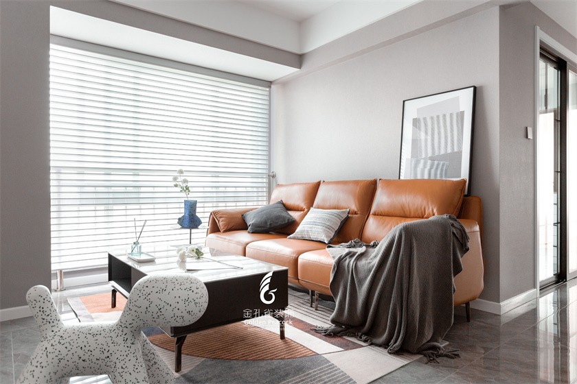 橙色的沙发配上灰色的茶几与电视柜,加上一些精致的小摆件,改造后的客厅使用电动梦幻帘限度引入自然光,使得整个空间更加灵动活泼。
