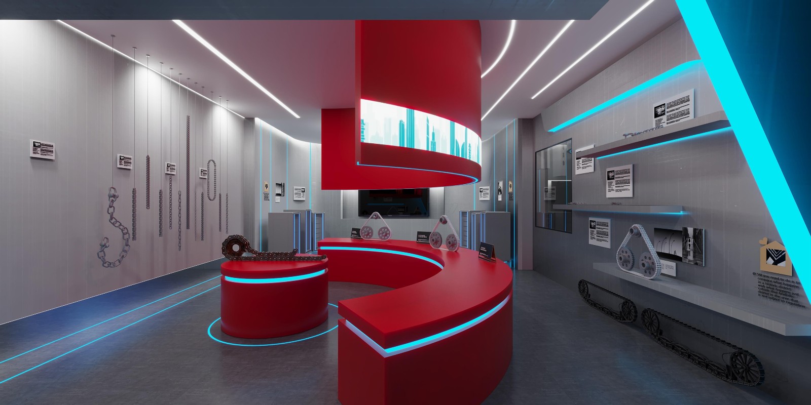 这是一个链条为主的展厅,空间上客户需要:科技、未来、颜色。满足未来的需求,又要满足客户到展厅以后对产品的需求。