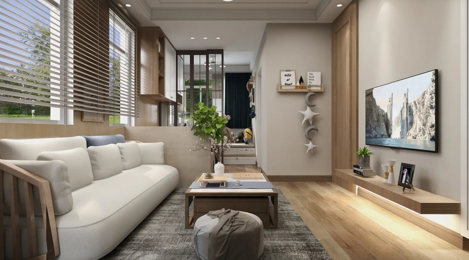 户型整体空间并不大,但是客厅的空间还是足够的,原木日式的风格让整个空间使人心旷神怡,能充分感受到自然的气息。
