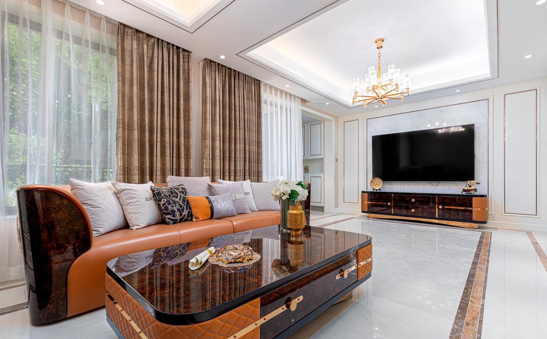 以爱马仕橙色为主色调,辅以金色与琥珀色,琥珀色玻璃茶几与电视桌材质遥相呼应。显得更加高贵,这样色也是业主喜欢的。显得喜气而且也耐脏。橙色沙发和茶几的包边相得益彰,遥相呼应!