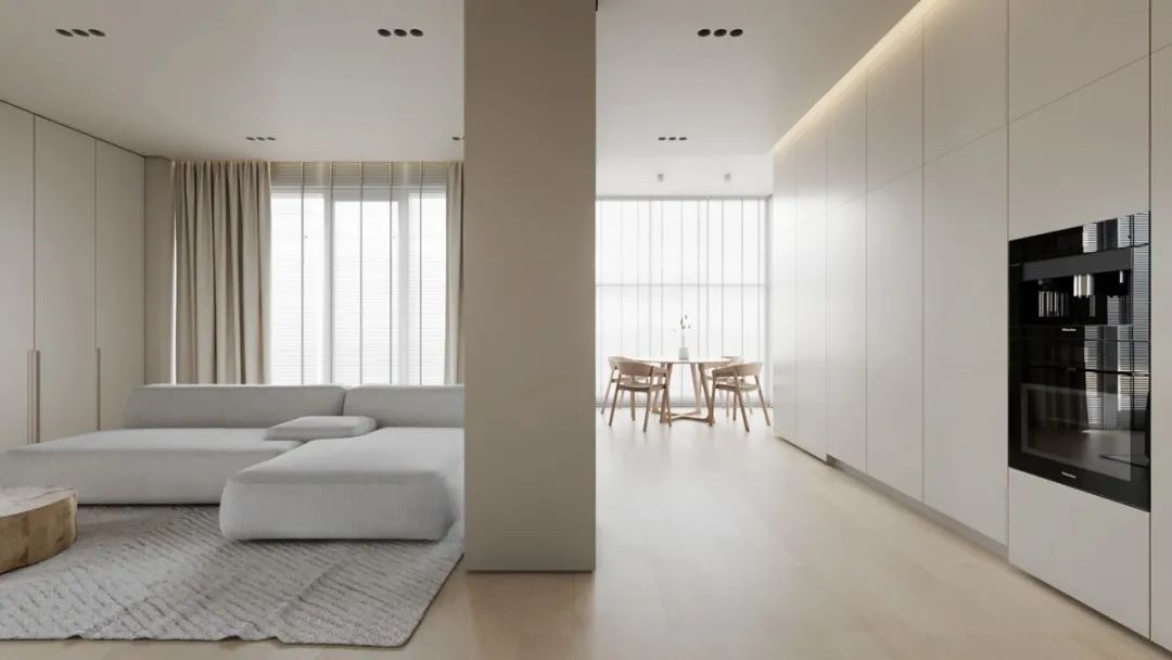 本案屋主是一位精致且注重仪式感的90后小姐姐,个性鲜明,对于自己的家有着明确且独特的想法。设计师将整个空间大面积留白侘寂美,承载了纯粹且过目难忘的意境,左右两侧为休闲待客的客餐厅、向前则进入更为私密的寝居空间及衣帽间、每个体块的自由穿插与亲密连结,动线清晰合理,从很大的程度上阐述了居者的一种简单洒脱的生活态度,释放居者的灵魂与思绪。