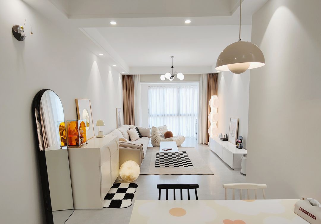 因为没有太多的收纳需求,客厅只定制了一排一字型电视柜,再加一个白色北欧风靠墙柜,陈列简单,既能储物也能当作地面展示台。