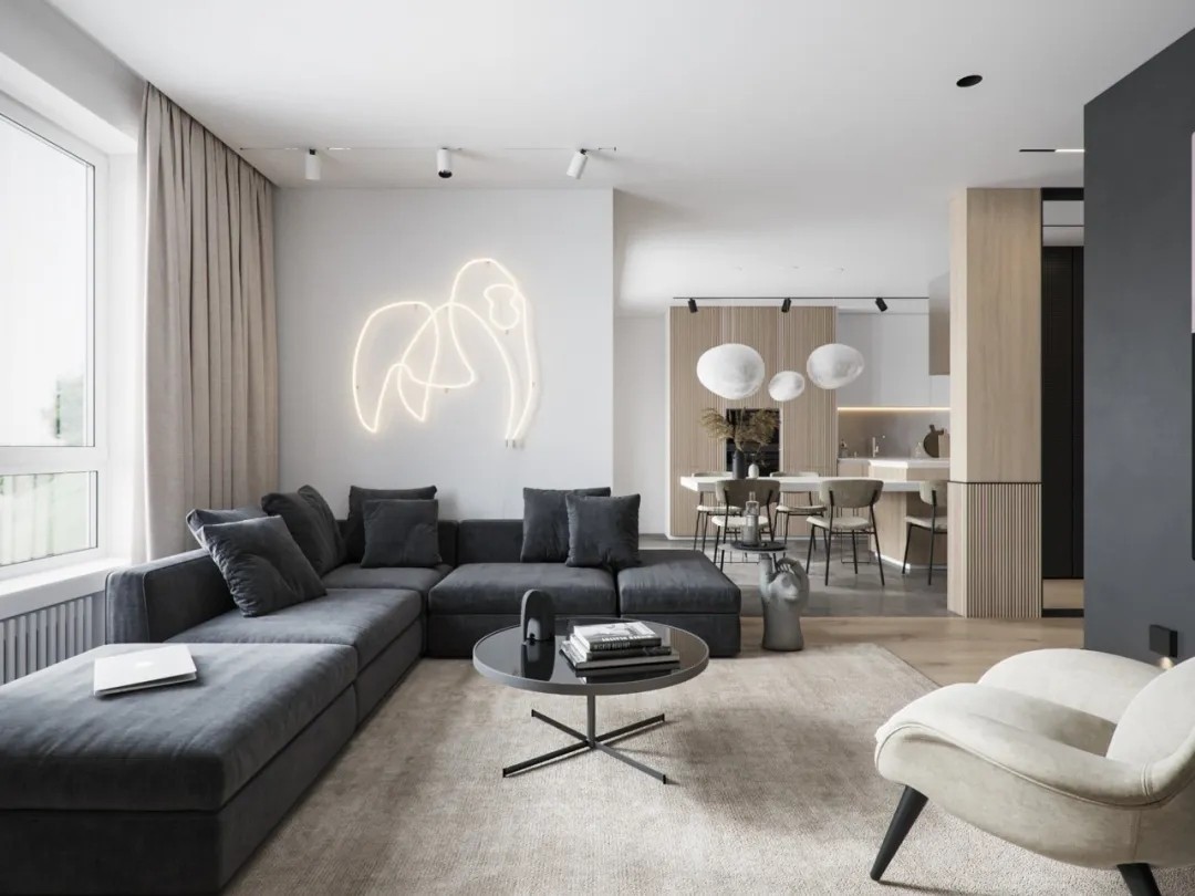 整屋墙面做了微水泥,干净耐脏,没有很复杂的装饰,无主灯设计,内嵌式电视机搭配到大理石台面,极简味道十足。反绒皮沙发搭配地毯为空间增添很多层次感。
