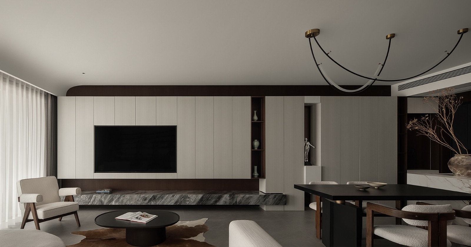 立面转折之际,激发出重轻相间的视觉张力,构建悬空形态,平衡由重量感,同时结合大理石、皮质、布艺等材质,将色彩温度、错落美学、点睛装饰逐次共和,树立起会客场域的气度与韵味。