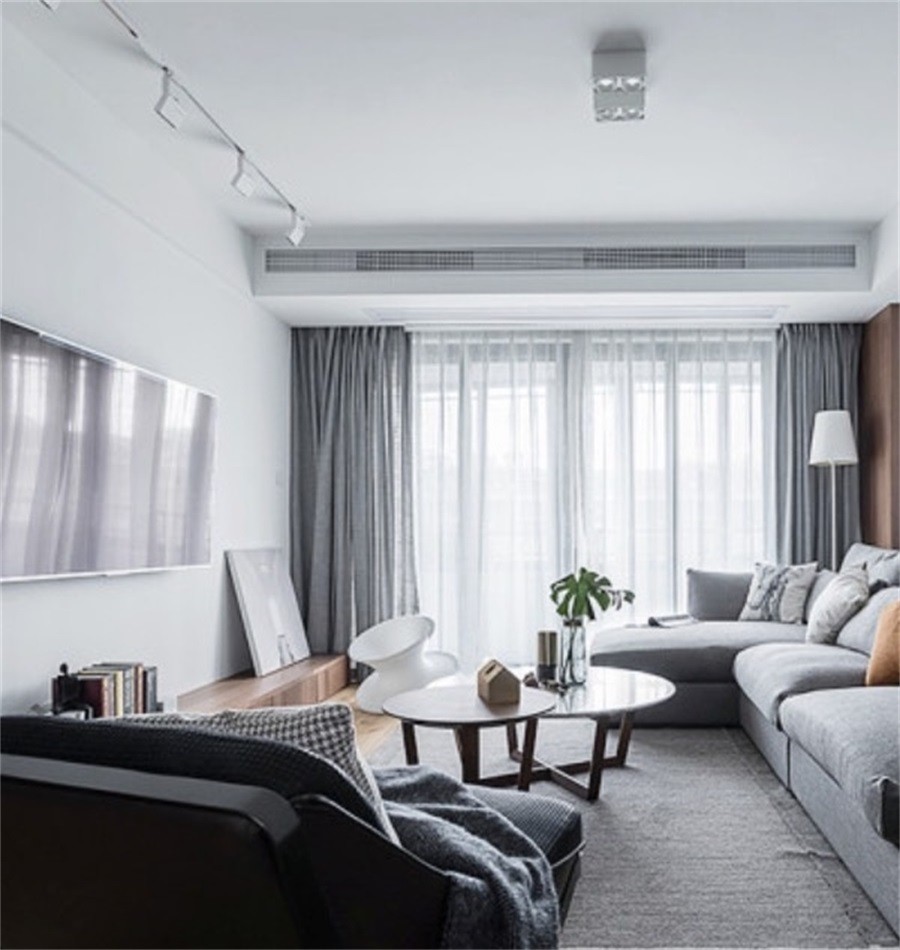 灰色的布艺沙发搭配灰色的地毯,有着一些北欧风的感觉。