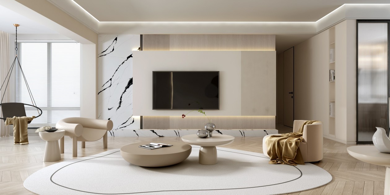 客厅整体色调以奶油色为主浅色系背景墙可谓是***亮点