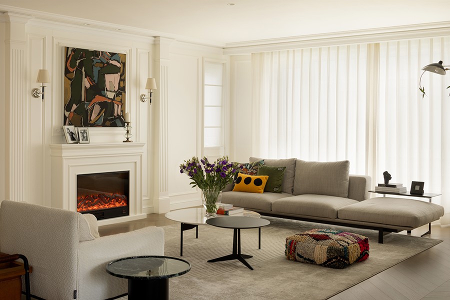 作为一个想要展示的空间,在整个设计中设计师利用原户型的错层结构,与客厅做了一个动静分区的过厅,连接至女主的衣帽间,让空间与视线得以延伸连续。大厅地板通铺鱼骨拼更为复古,在规整之中又有着灵动感和立体感,从不同角度可以看到不同层次的美。