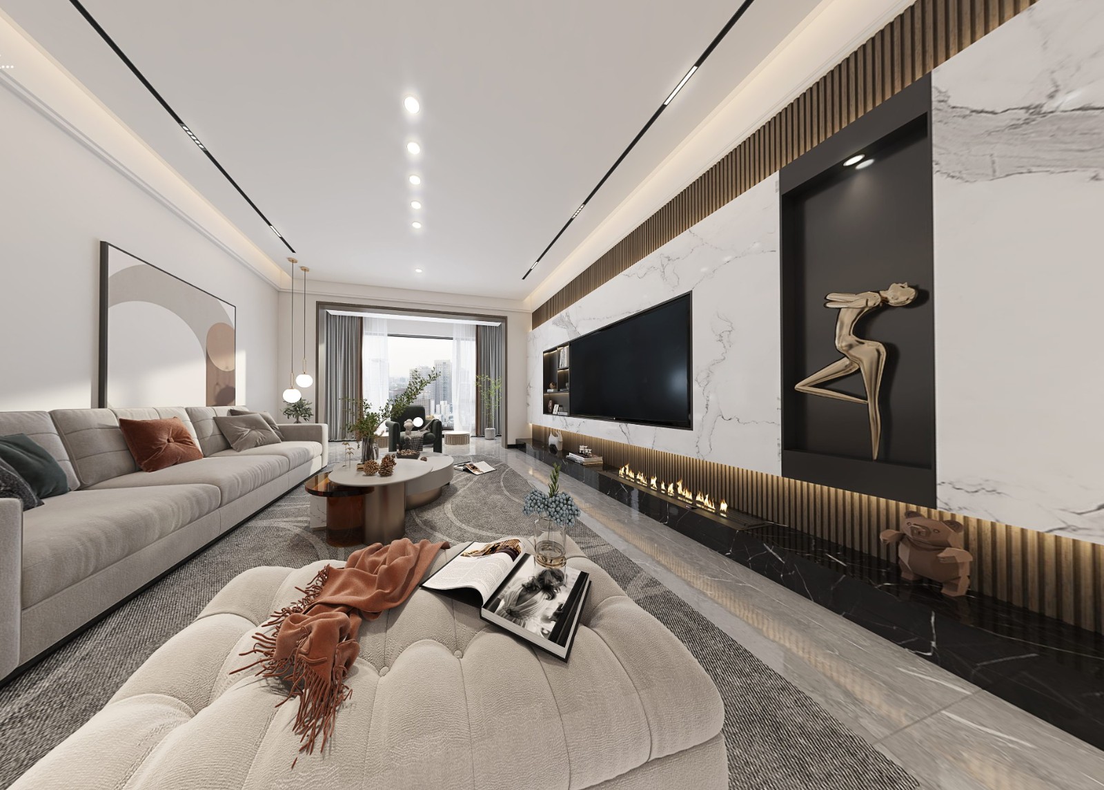 轻奢客厅,岩板+木格纹质感更强