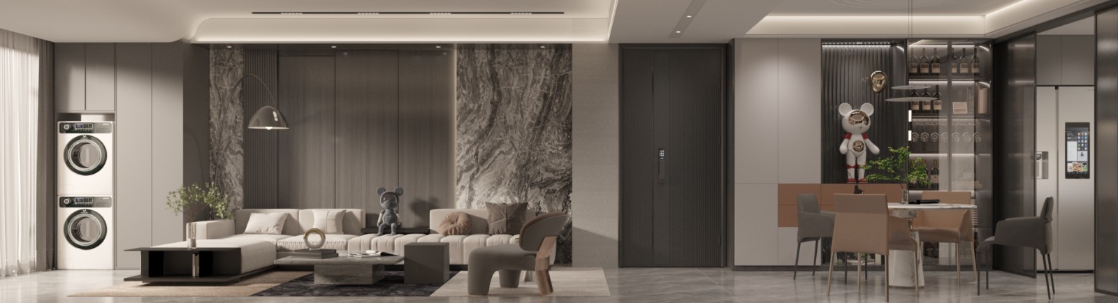 该区域为客餐厅区域,整体板材和灯光的运用使得整个空间的氛围感上升了很大一个层次