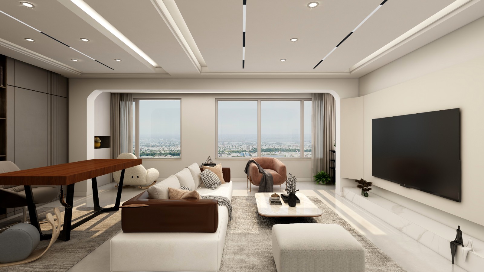 客厅造型以简约为主,简单的线条和局部弧形设计,演绎出现代度假的慵懒感觉;满足于主人宴会、交友的情景;米色系列的泥塑感,契合白咖柔软沙发,给人一种温暖明亮的感觉;无主灯设计,射灯一开,氛围感满满。