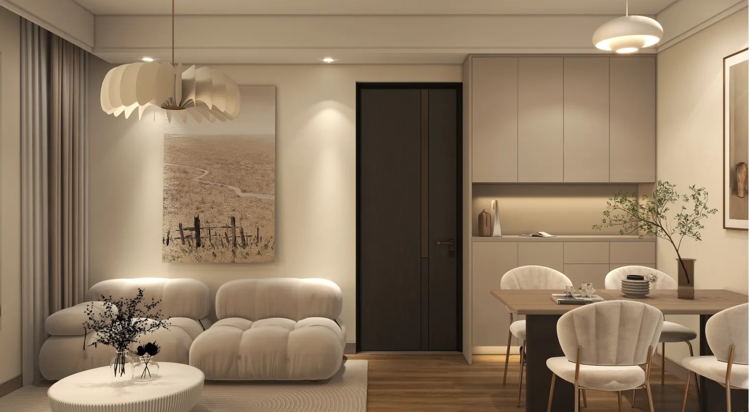 客餐厅都采用了简约的家具搭配,入户门处做了个柜子,可以方便储物以及展览。