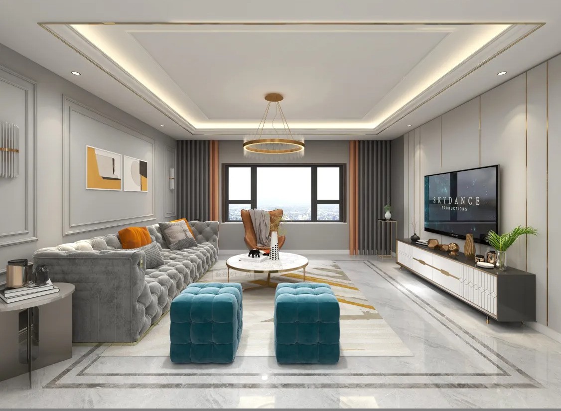 中心是宽敞的客厅和厨房,墙壁上的灰色、和点缀的橙色相呼应