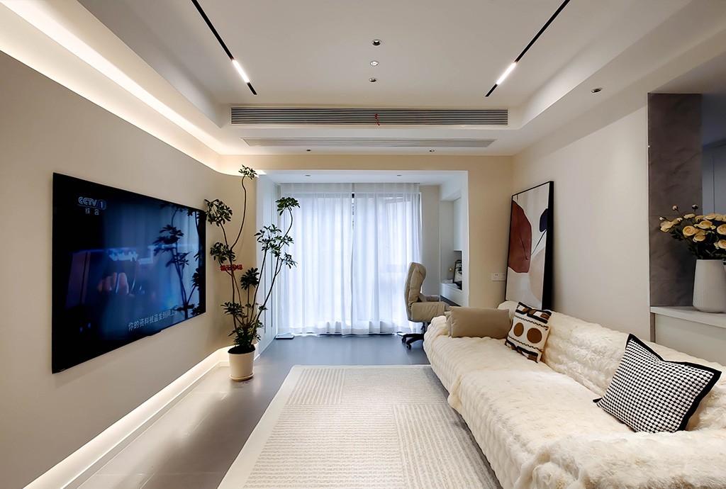 电视背景墙采用悬浮设计,搭配氛围灯,显得简约大气,风格统一,让空间更加整洁。
