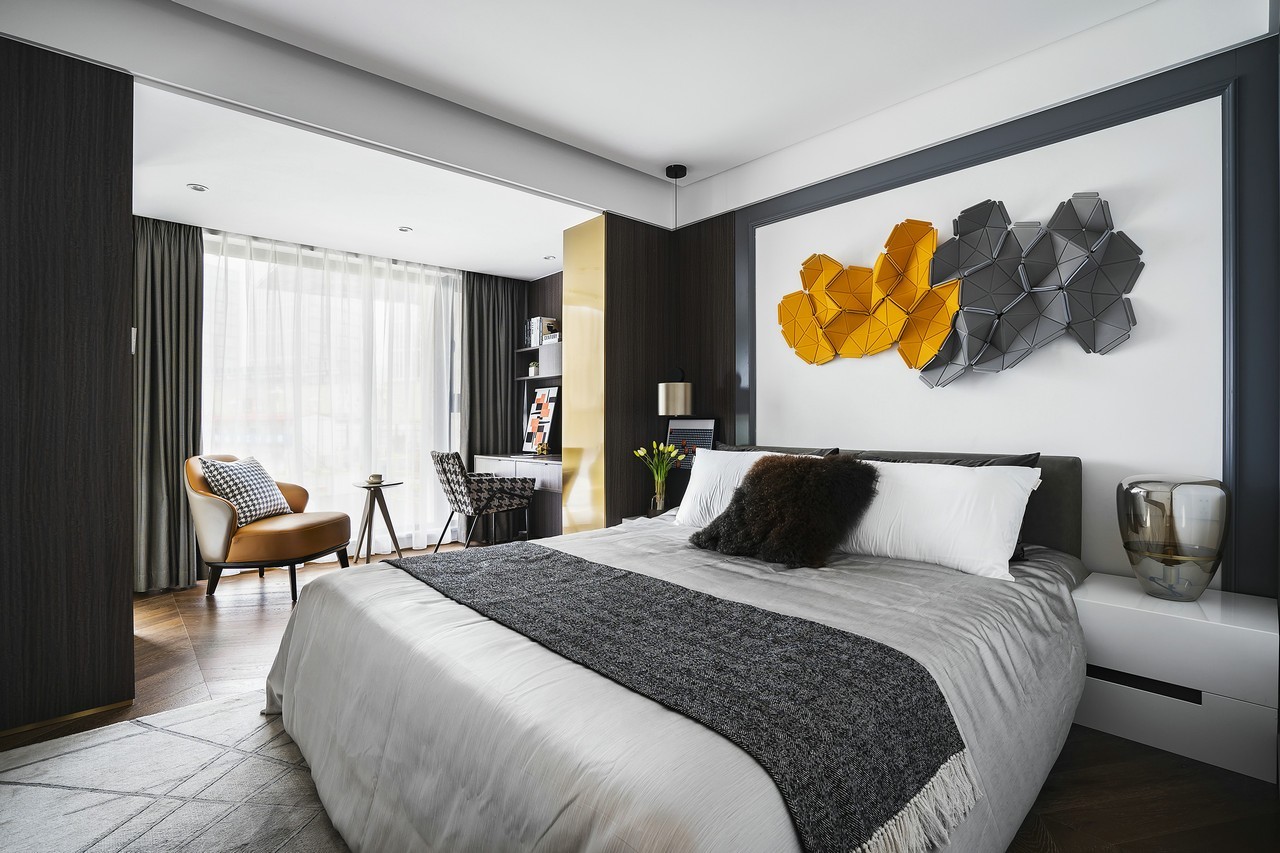 卧的氛围格调以灰色为主,在白色基础色调的映衬下,整个给人的感觉就是年轻简单。