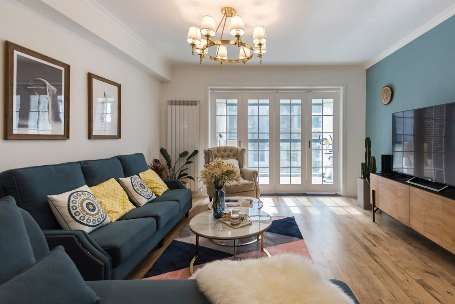 暖色调的客厅更能让人感受到家的温馨,蓝灰色电视背景墙能给客厅添加一些不同的色彩,使客厅颜色更显丰富。