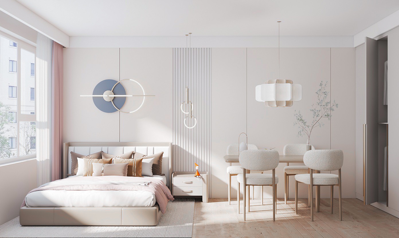 客餐厅正视角,低饱和的米色系,是显得比较***的配色,是年轻女性的***。