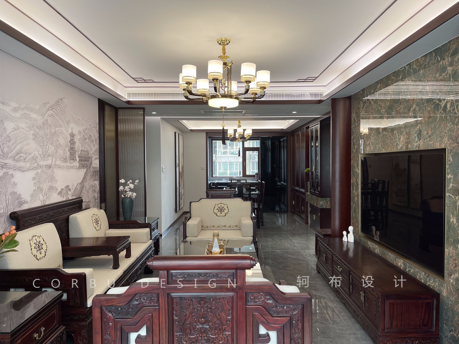 沉稳端庄的格局,木质、石材、镜面元素的运用,大面积稳重的木色让客厅显得更加舒适高档。