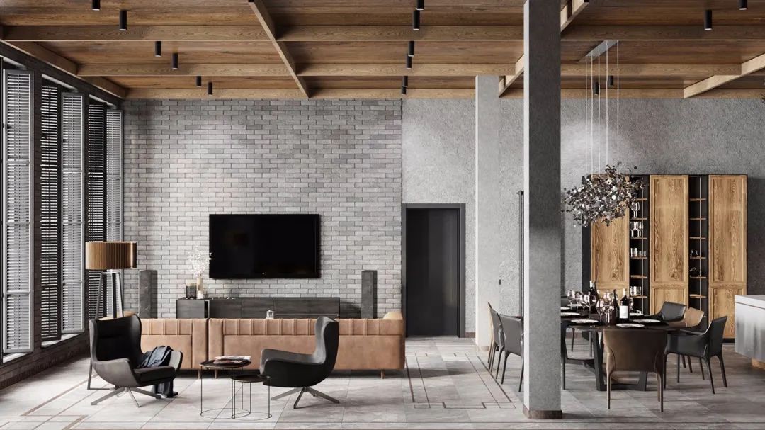 客厅电视墙是灰青色的砖墙背景,天花材质是木质感的吊顶+明装筒灯的无主灯,加上外露的柱子,有一种原始自然的工业范。