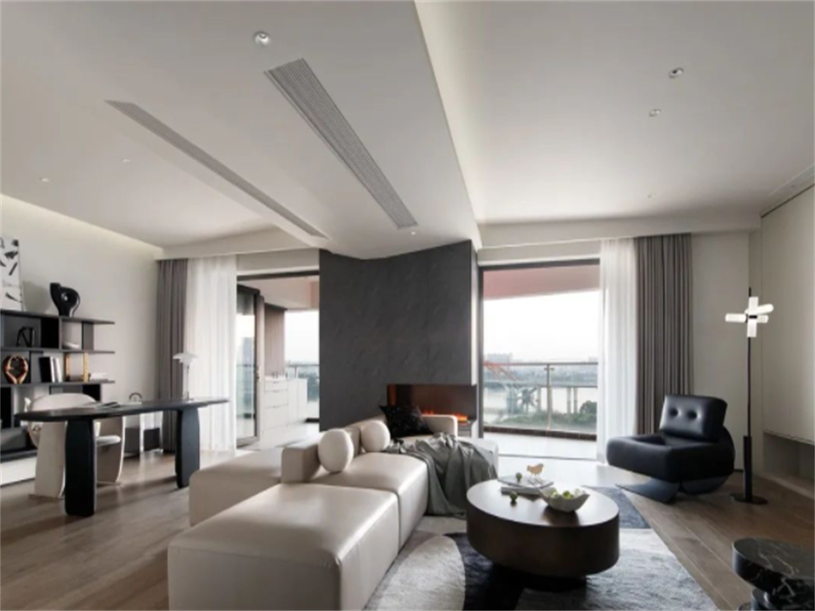 拆除书房与客厅之间的墙体,并与阳台串联形成洄游动线,选择双面可坐的沙发,增加了空间的多变性、灵动性及趣味性