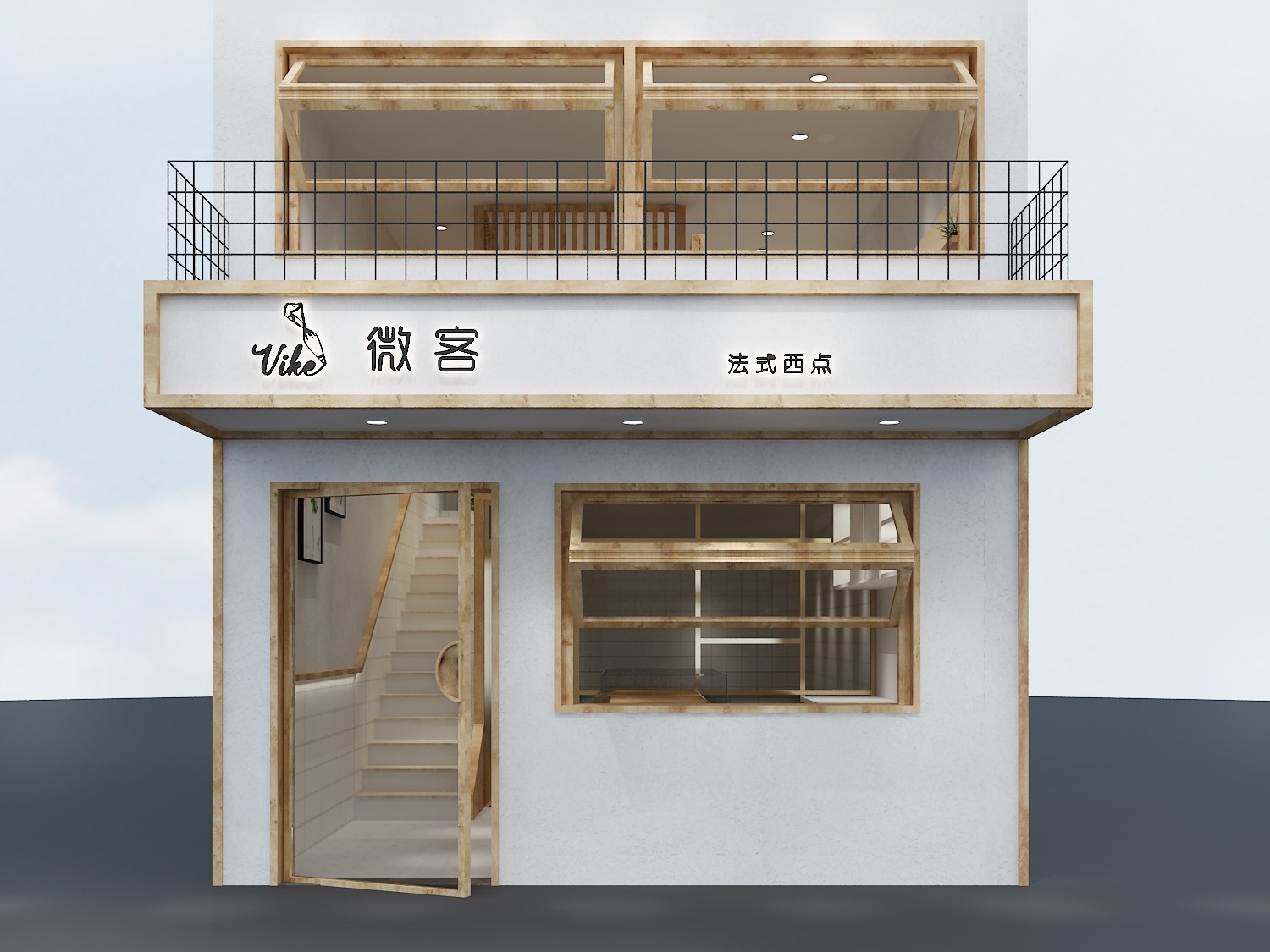 简欧风格微客蛋糕店,室外金色不锈钢造型,室外肌理漆。