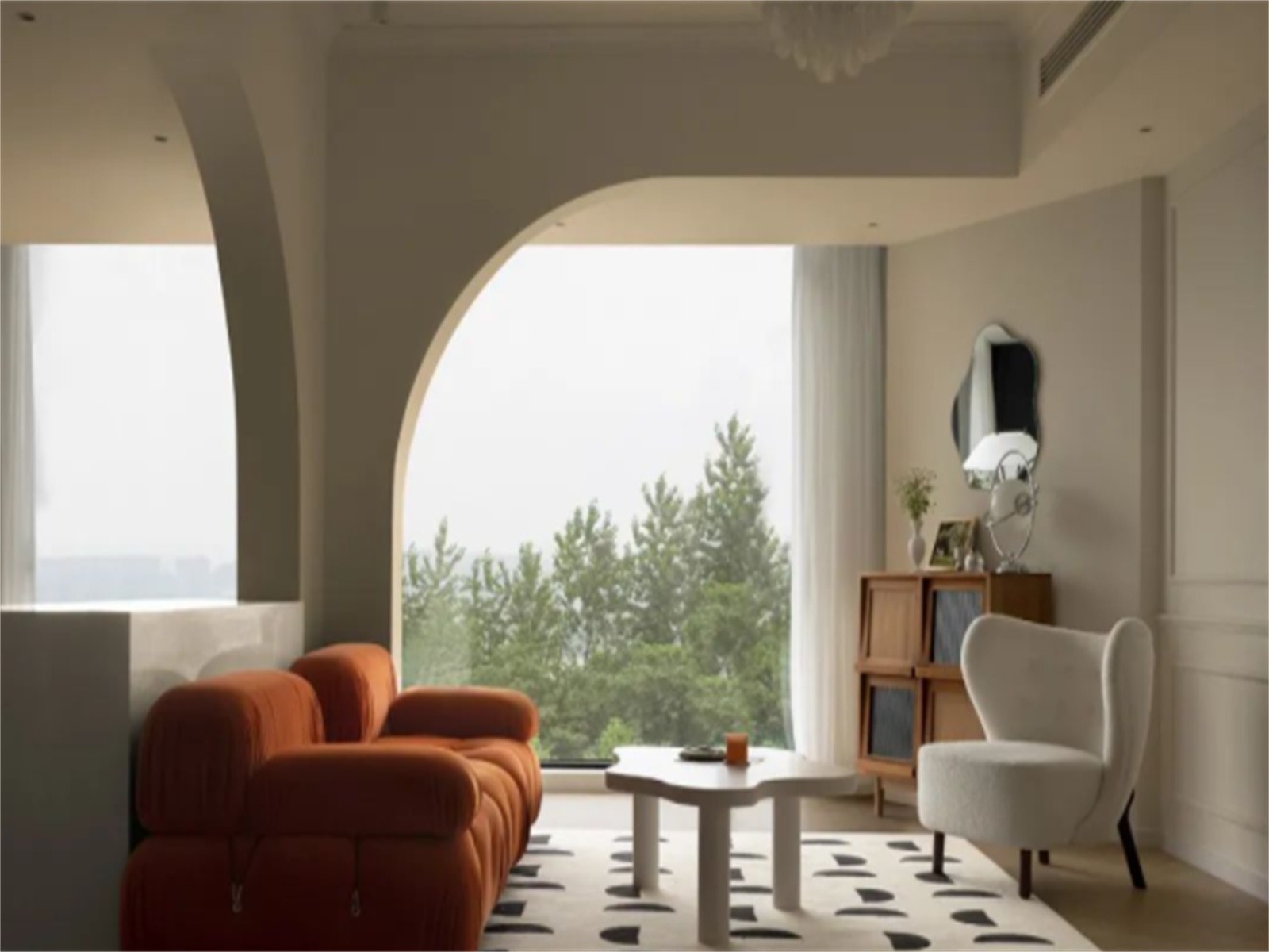 圆润的沙发,窗帘轻和,营造舒缓自由的氛围,这一处温柔的美,和窗外的绿荫适配度***,很难不对法式复古风着迷