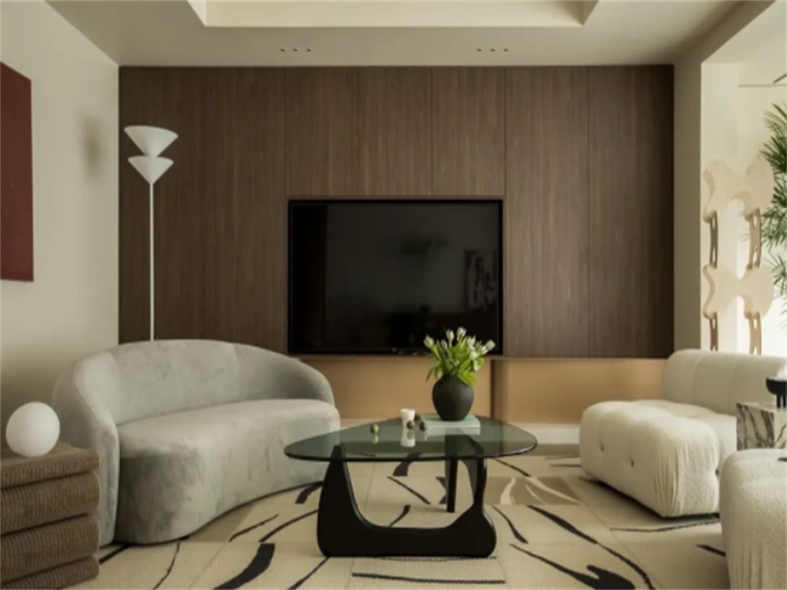 沙发布置成围合式,让家人愿意一起待在这里聊天互动,轻松和乐地相聚,用胡桃木色定制柜体打造客厅背景墙,既能营造空间复古氛围同时增加收纳空间,整个柜体相当于33个24寸行李箱体积容量,将客厅区域需要收纳的日常用品通通隐藏