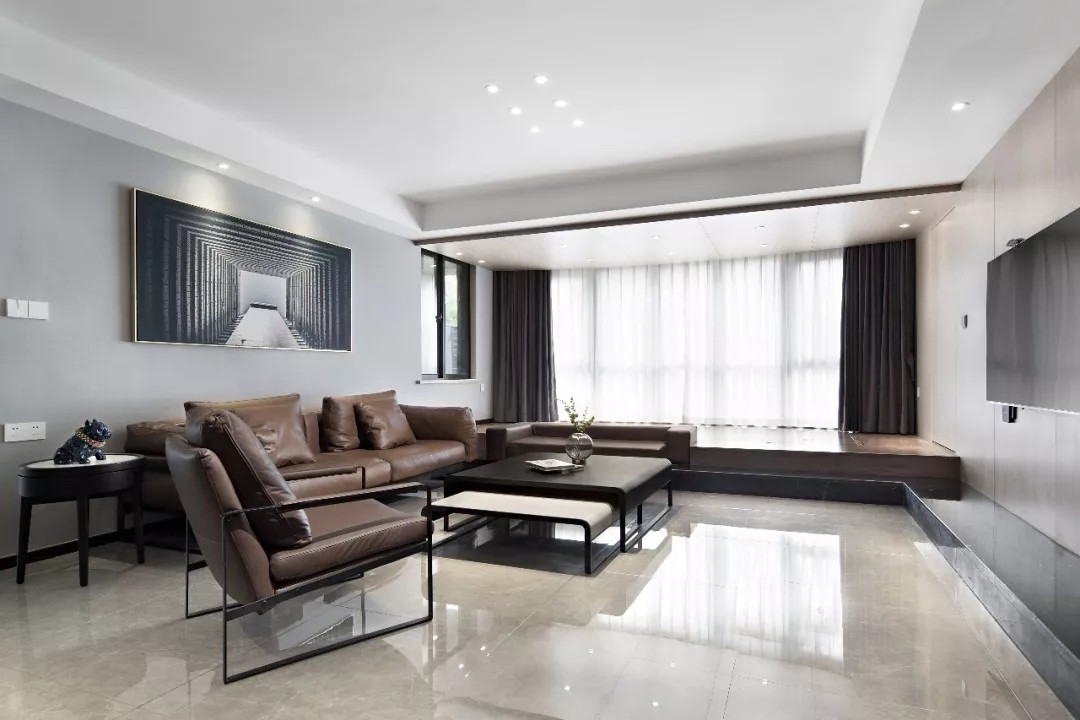通铺米色的石纹地砖,以黑色收边,温馨而不失时尚感。棕色皮质沙发质感与舒适感兼得。沙发背景选择了一幅视觉延伸感很强的画作做为装饰,意境悠远。