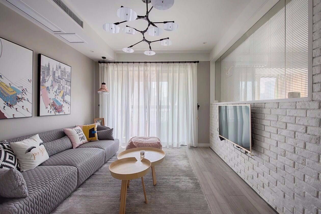 这是一套面积仅65平米的北欧风格案例,设计师将电视墙和卧室的墙打通,装上百叶窗,让原本狭小的客厅空间看起来宽敞又明亮,文化砖做的电视墙和吧台,文艺范儿十足