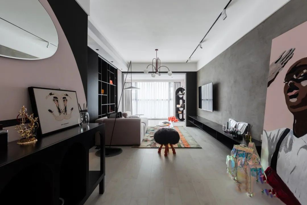 餐厨与客厅形成LDK模式,由水泥灰墙面连接空间,左侧做一面黑板墙与粉色乳胶漆形成不对称设计,搭配置物柜打造个性端景