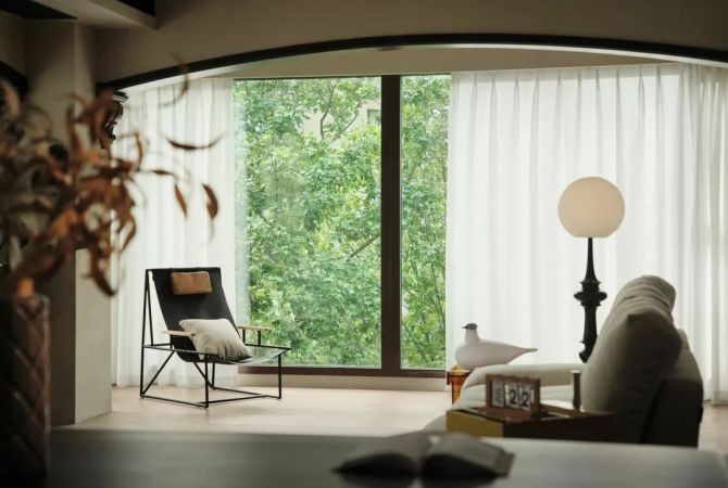 窗外的树木也成为天然的屏障,因此窗帘只采用单层的 落地白纱帘 ,保留采光与空间浪漫氛围。铁艺构架的躺椅靠窗摆放,眺望绿意,仿佛生活在森林里的惬意舒爽,静谧又清新,瞬间卸下一身疲惫。
