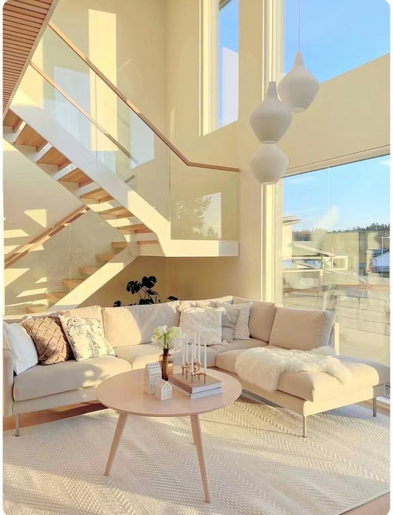 客厅以简单为主,大白墙,木地板,落地窗,阳光塞满房间,视觉显大还敞亮