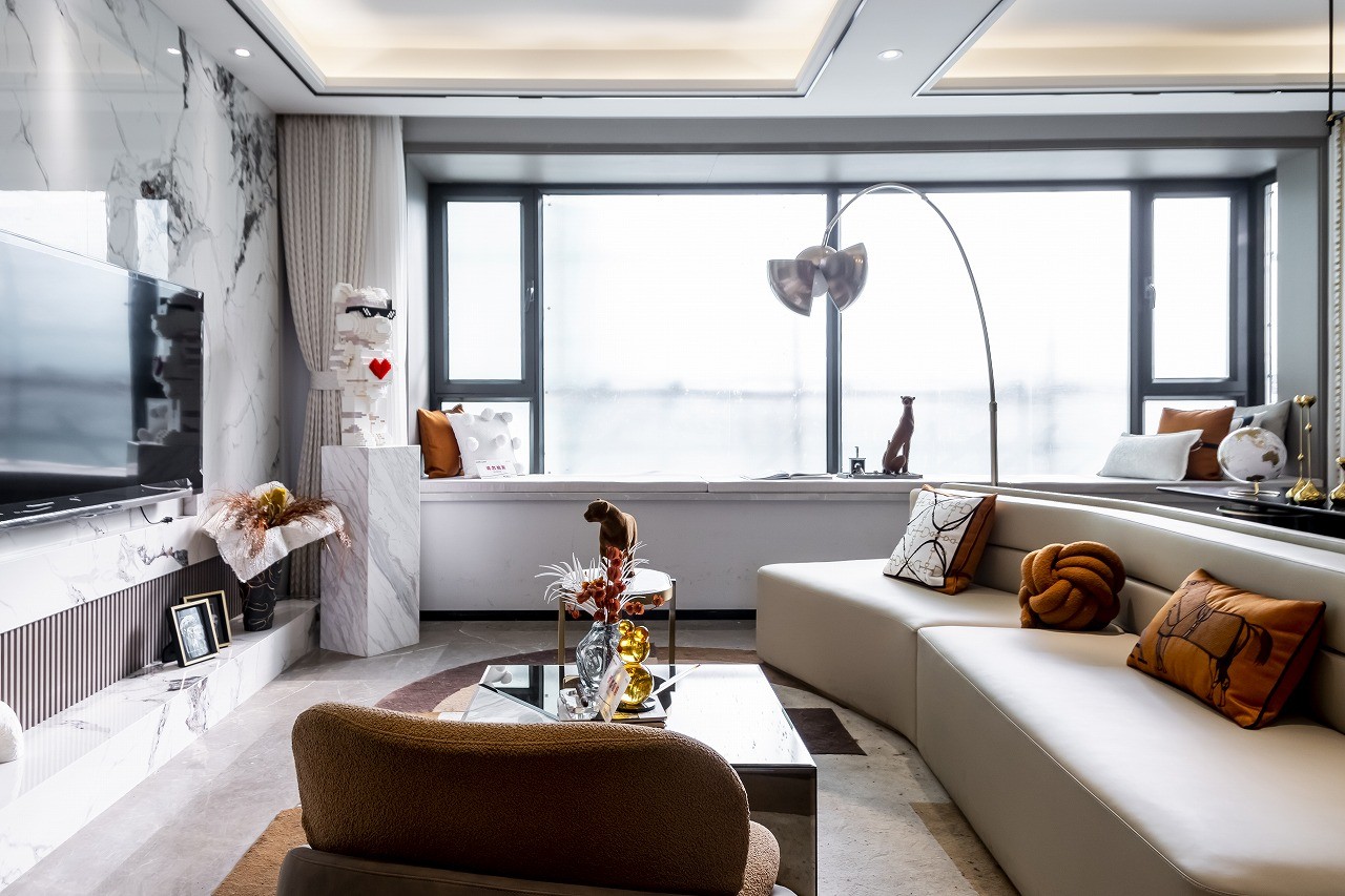 客厅做了开放式书房,一整面的柜体满足储物功能,柜体做了玻璃设计,更符合轻奢的质感,整体空间更加开阔,视野更加明亮。
