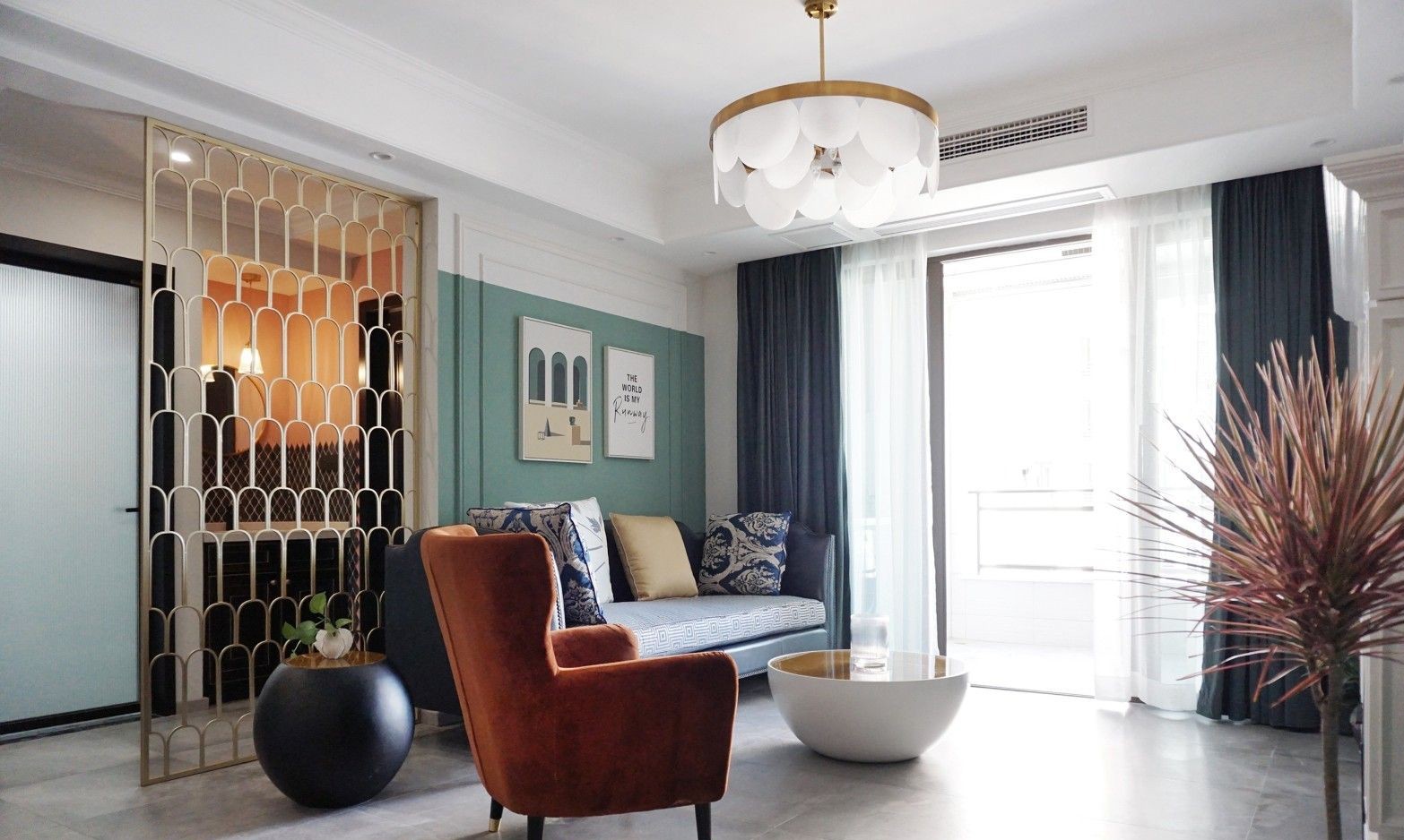 皮质沙发和黄铜材质茶几相衬,显得大气沉稳。橘色丝绒单人沙发映入眼帘,跳跃式的色彩搭配,让稳重的空间多了一丝热情。
