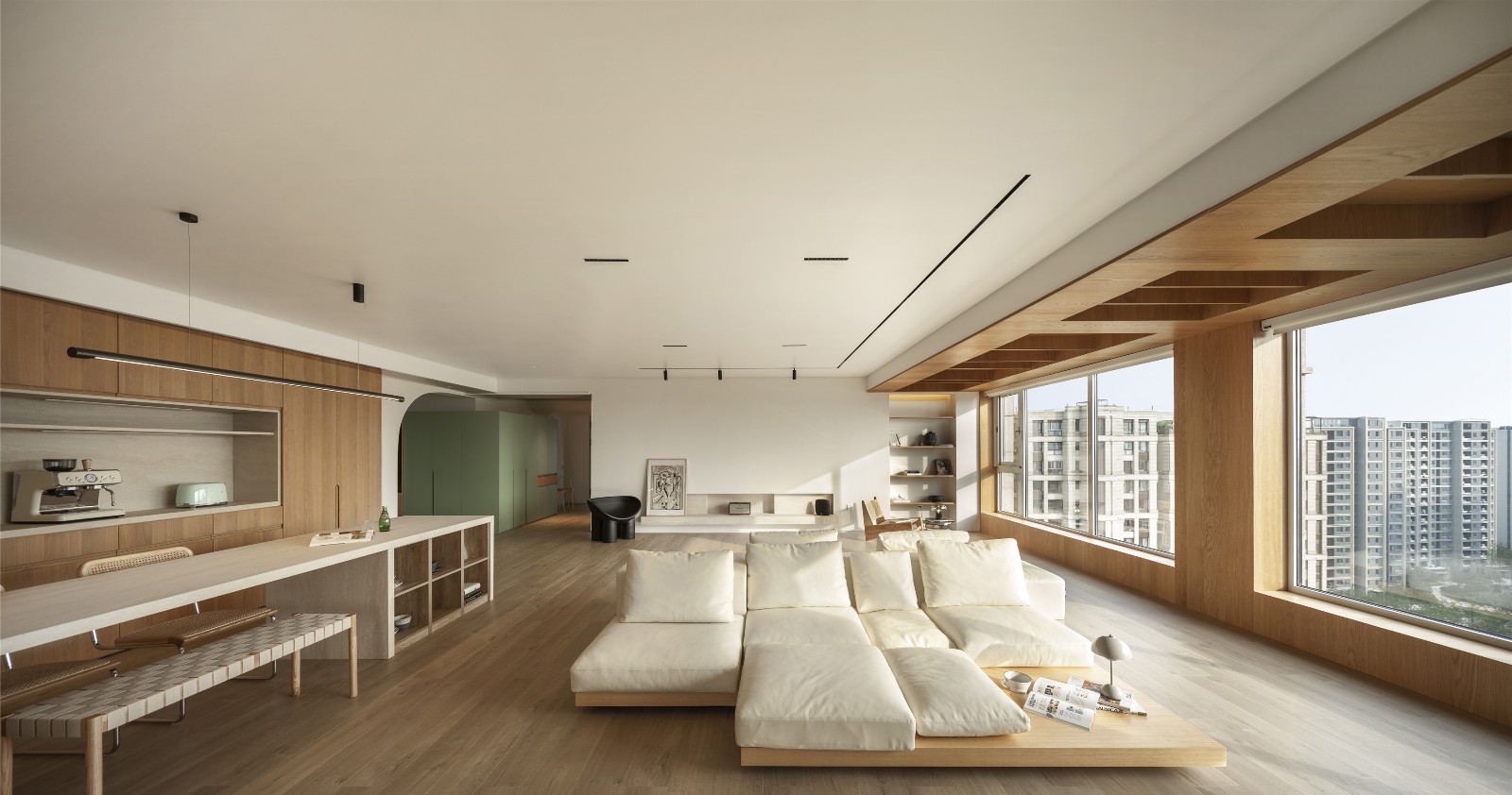 切割成两部分的大空间里以沙发作为分界点,无论是空间里大件的木质家具,还是带有原木材质的点缀,都与整体风格统一,让自然的味道时刻在身边萦绕。