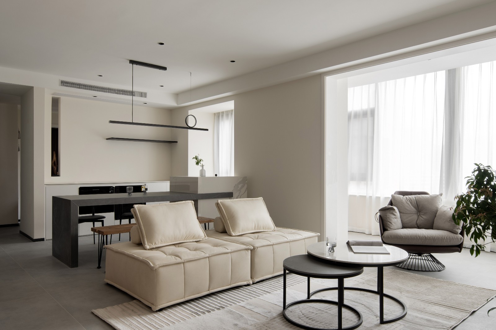 整个客厅区域是一个休息空间,也是家长与宝贝互动的地方。男主人除了做饭,带娃也很有一手,他喜欢在这里与孩子们一起玩乐、读书、学习,享受着一家人的休闲时光。