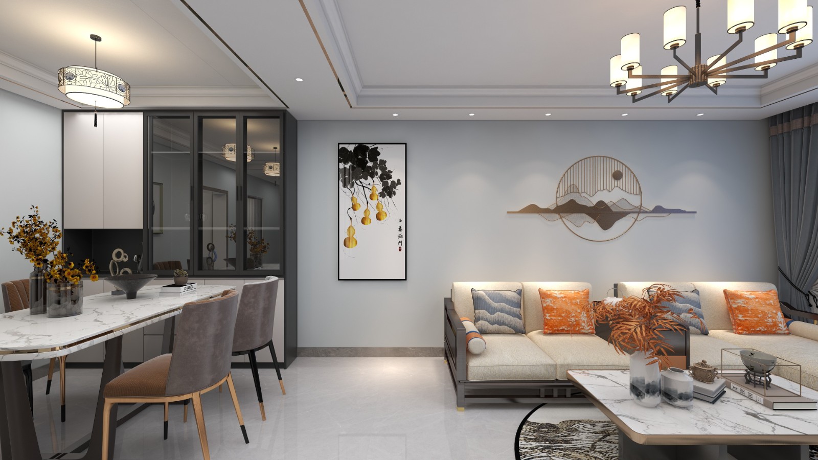 入户即餐厅,客厅与餐厅在一个空间中,吊顶与布局相呼应,独立又统一,墙上的装饰画寓有柿柿如意寓意,现代简约强调室内开阔理念打破原有复杂繁琐的设计元素。以灰色墙面为主色调,米白色沙发相衬,突出的橘色做点缀,色彩对比鲜明,舒适轻松