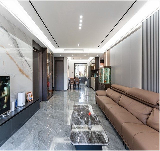 电视背景墙采用大理石装饰,沙发墙以木饰面板和格栅装饰,简而精的线条与深色系沙发组合,以简单的灰色系配色体现了整个空间