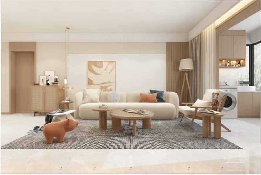 电视背景墙护墙板隐形门造型以简单的奶油系配色温柔了整个空间。