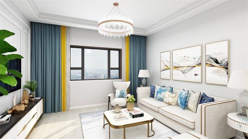 客厅以白色为主色调,白色沙发放置其中配以蓝黄色软装装饰,空间舒适而温馨