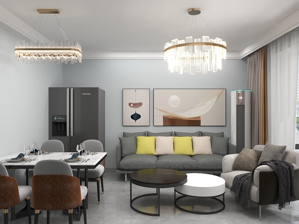 客厅采用了以灰色为主搭配上蓝色的背景墙更显年轻,加上沙发上的黄色点缀有了活泼的感觉