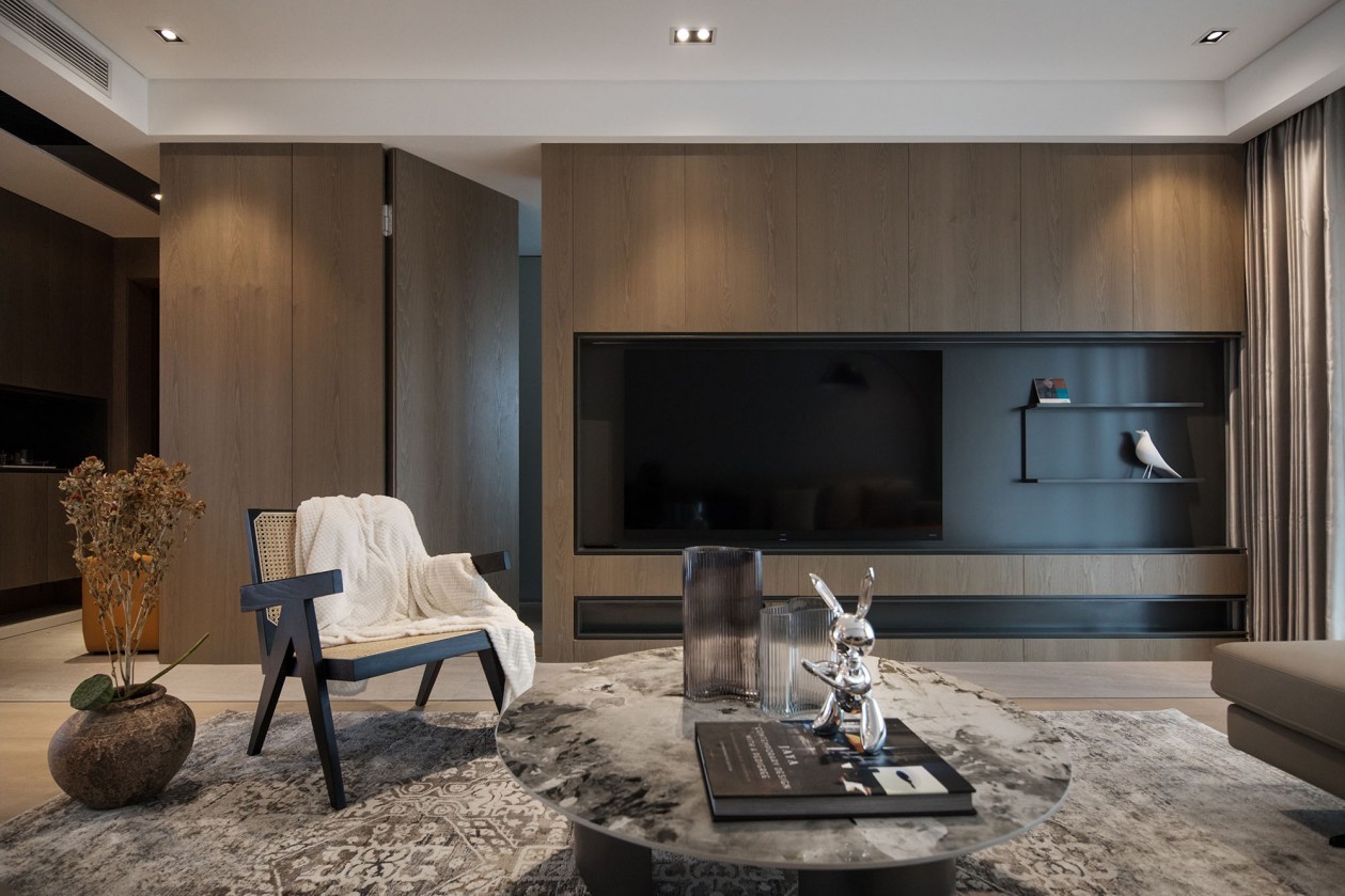 客厅采用木饰面打造电视背景墙,看似连贯一体、整齐干净,实则暗藏了一道隐形门。空间充满了不确定性,在动静状态下,创造无限的变化和可能。极具浪漫的层叠、碰撞、协调,在交错的光与阴翳之下,显现了漂浮的美感与诗意。