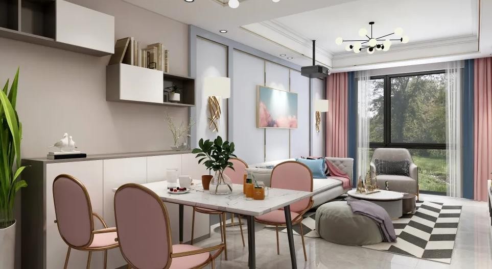 整体偏明亮的,粉色点缀,客餐厅做了吊顶划分区域