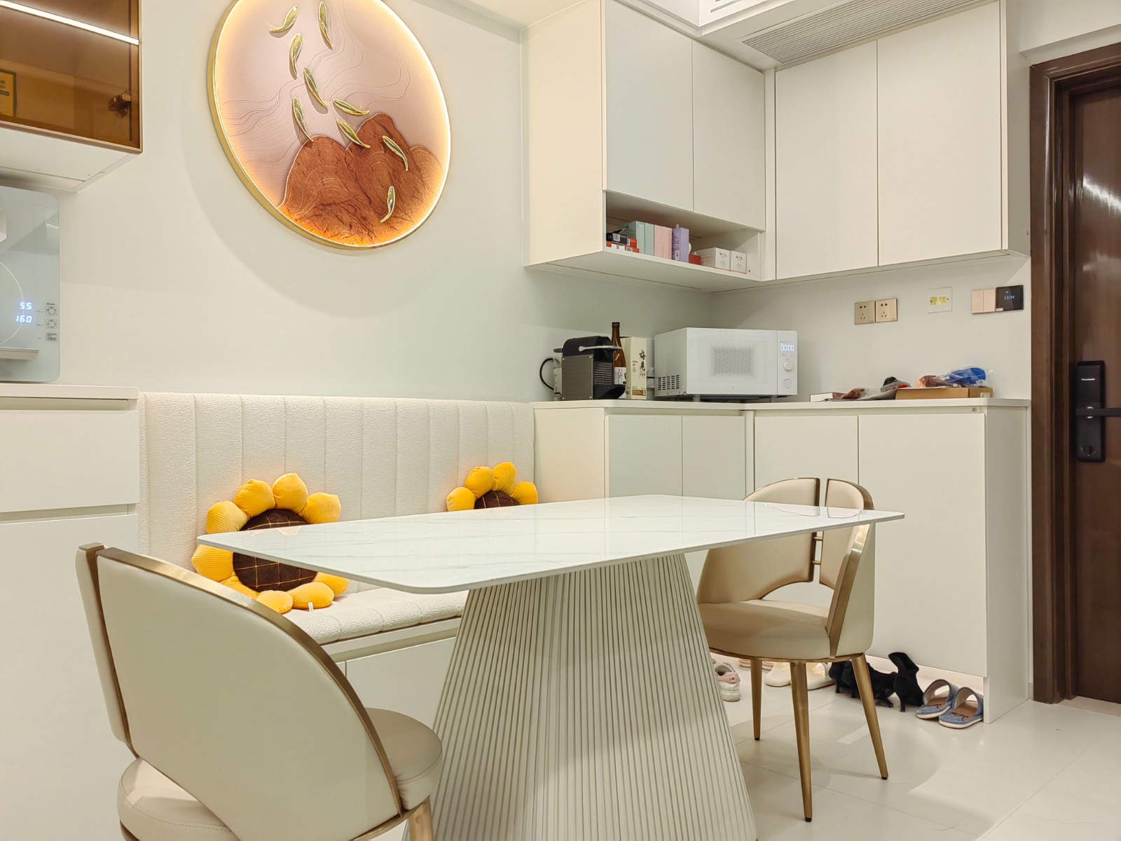 餐桌是两位卡座的设计,左右两边做中空开放柜,餐边柜一体连接到入户门的鞋柜。做开放中空柜,连接到入户门玄关位置。柜深没有做很大,主要还是扩大空间的视野。