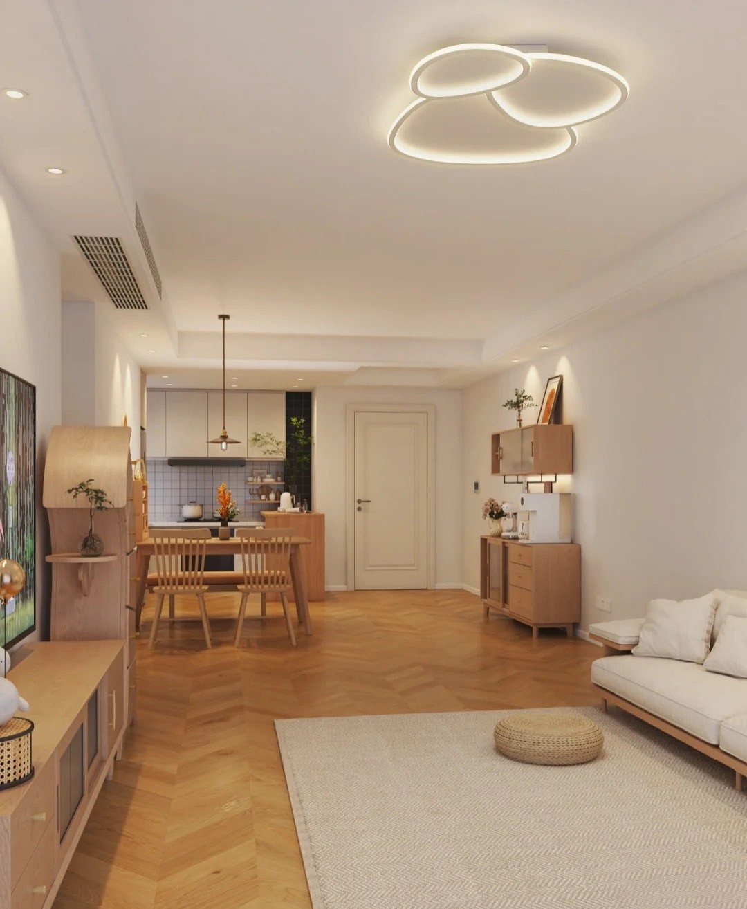 阳台打通纳入客厅后,整体视野十分开阔,且整体设计非常有层次感,以白墙+简约吊顶为上半层的浅色系,通铺木纹地板为下半层的原木色,加之一张灰色布艺地铺,层次感和立体感十分鲜明。在一盏多边形吸顶灯的烘托下,氛围感直出!