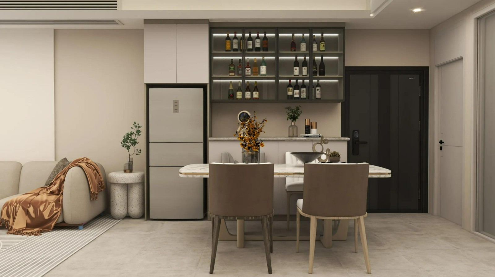 客餐厅一体,利用餐边柜做卡座,既解决了空间问题,又拥有了储物功能