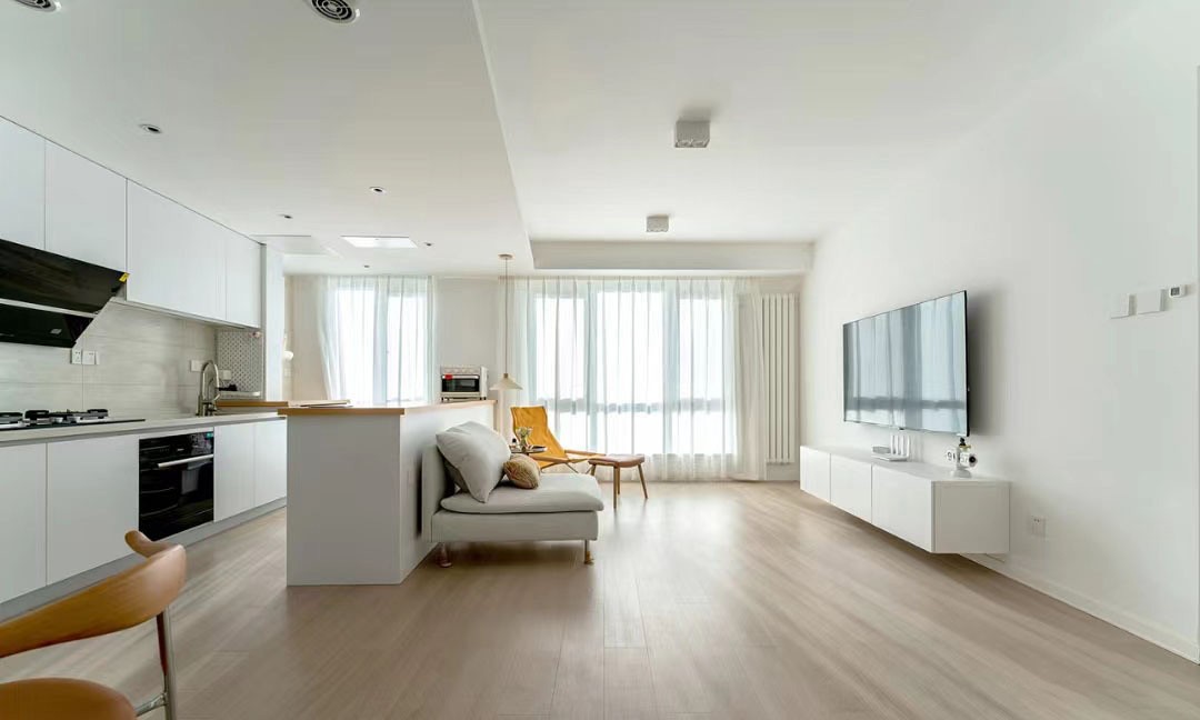 早上的客厅明亮十足,元气满满。厨房被打开后,从入户方向看过来,视觉也变得更加宽阔,让空间之间自由延展,联系在一起。