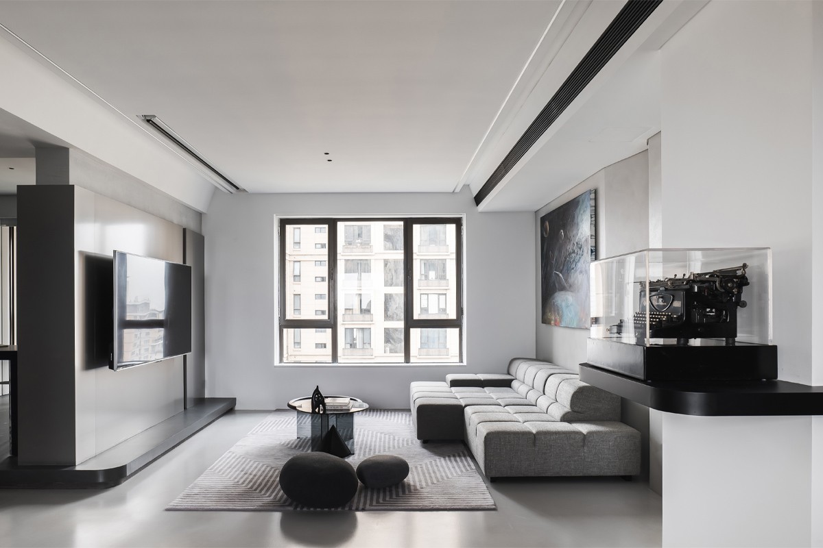 穿过玄关来到客厅,规整利落的线条,勾勒出空间的简约气质。 屋主要求不拆除整屋原来的地砖,表面附磐多魔,水泥的冷冽质感,正好契合女主人喜欢的冷调。