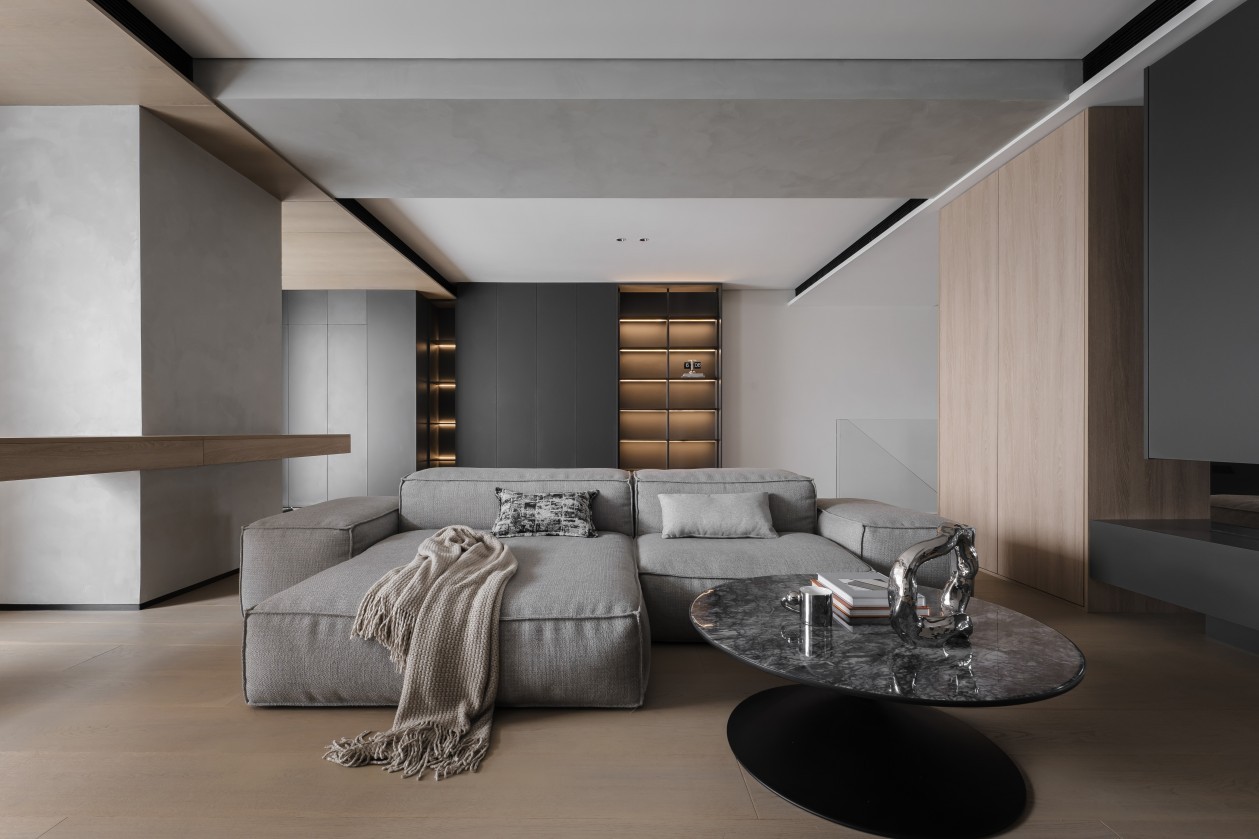 整体空间以经典黑白灰加以原木色为主题配色 。Living Divani 的定制款沙发是整个区域的核心,搭配十二时慢的艺术感茶几,呈现出鲜明有力的表现力,主宰了空间的***印象。黑色、木色不同纹理的门板搭配上镜面给人带来的呼吸感,不规则的设计中又有着规则的舒适度。收纳功能也在隐形中得到了提升。