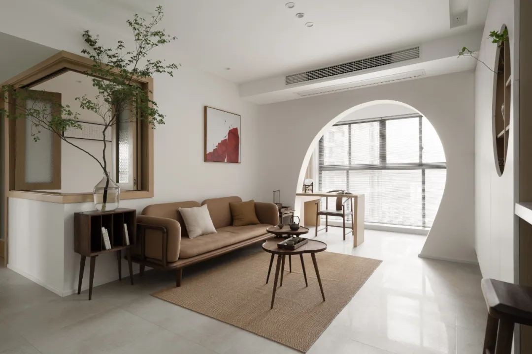 硬装的木作采用原木色+白色,软装则用黑胡桃深色提升质感。深+浅,轻+重的形式,空间的层次感十足。不规矩的方圆门,成为从餐厅的景墙转折到客厅阳台的亮点。