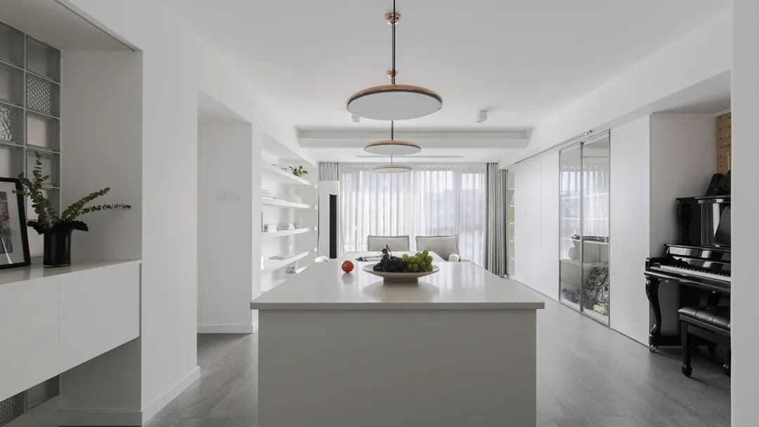 整个客餐厅明亮简约,白色柜体与白色墙漆,使整个房间的立面整齐划一。